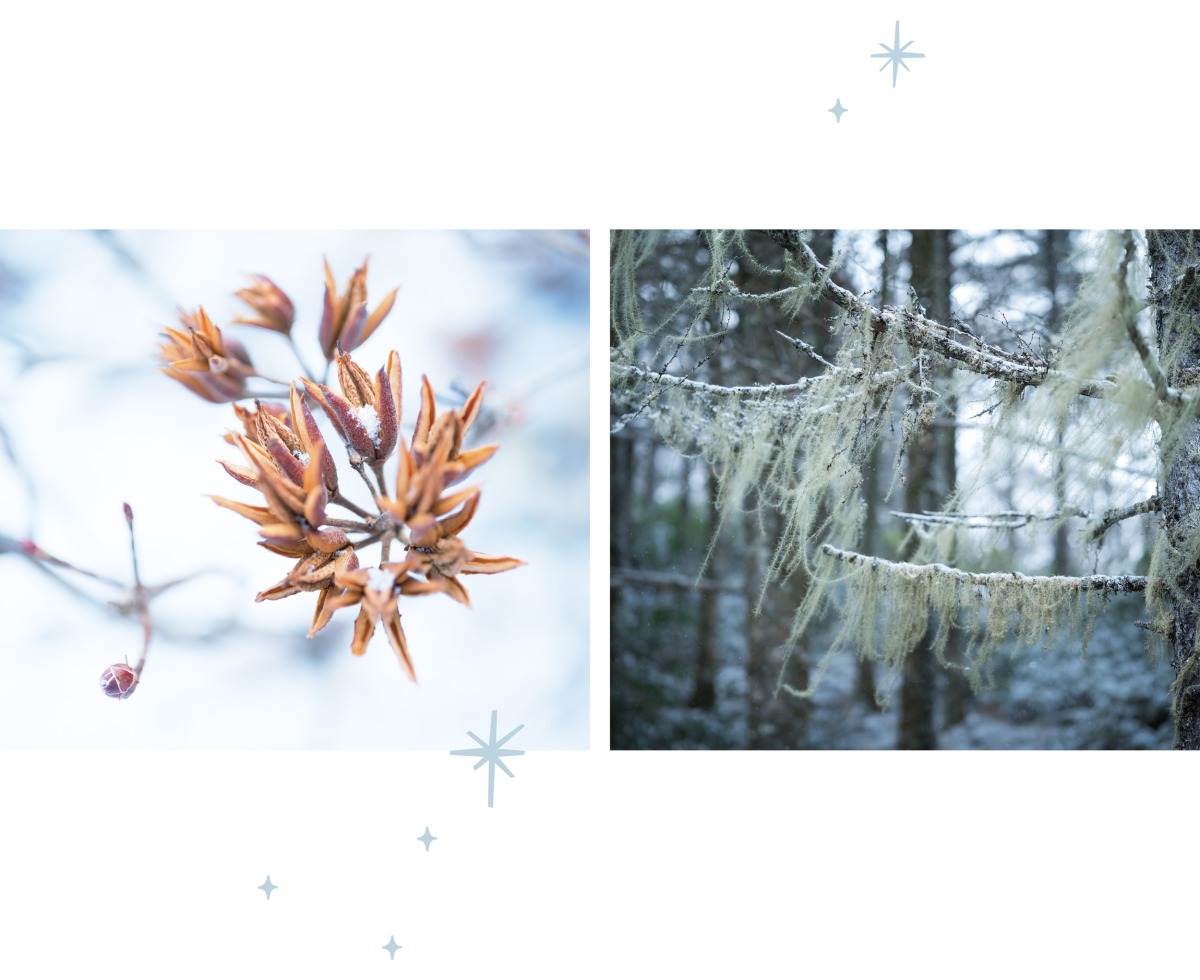 冷たい風に優しく揺れるサルオガセやドウダンツツジの冬芽を眺めながら歩いていると、華やかさだけが美しいことではないということを自然が教えてくれる。