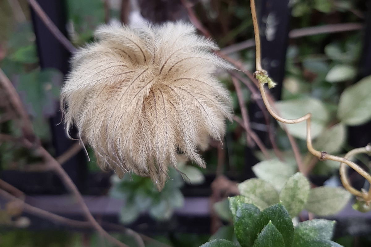 このギモン、もっともですよね。いったいどこが風車?といいますと、こちらの種子。これはあるお宅で撮影させていただいたクレマチスのものですが、種がなんだか風車みたい。ほら、「風車」でしょ……って説明をされたら、「うわぁ、本当だ。チングルマみたいだね!」ってだまされますよね。じつは名前の由来はコレじゃなくて、花がまるで風車みたいだから。ひねりをくれ、ひねりを~~~っ!!