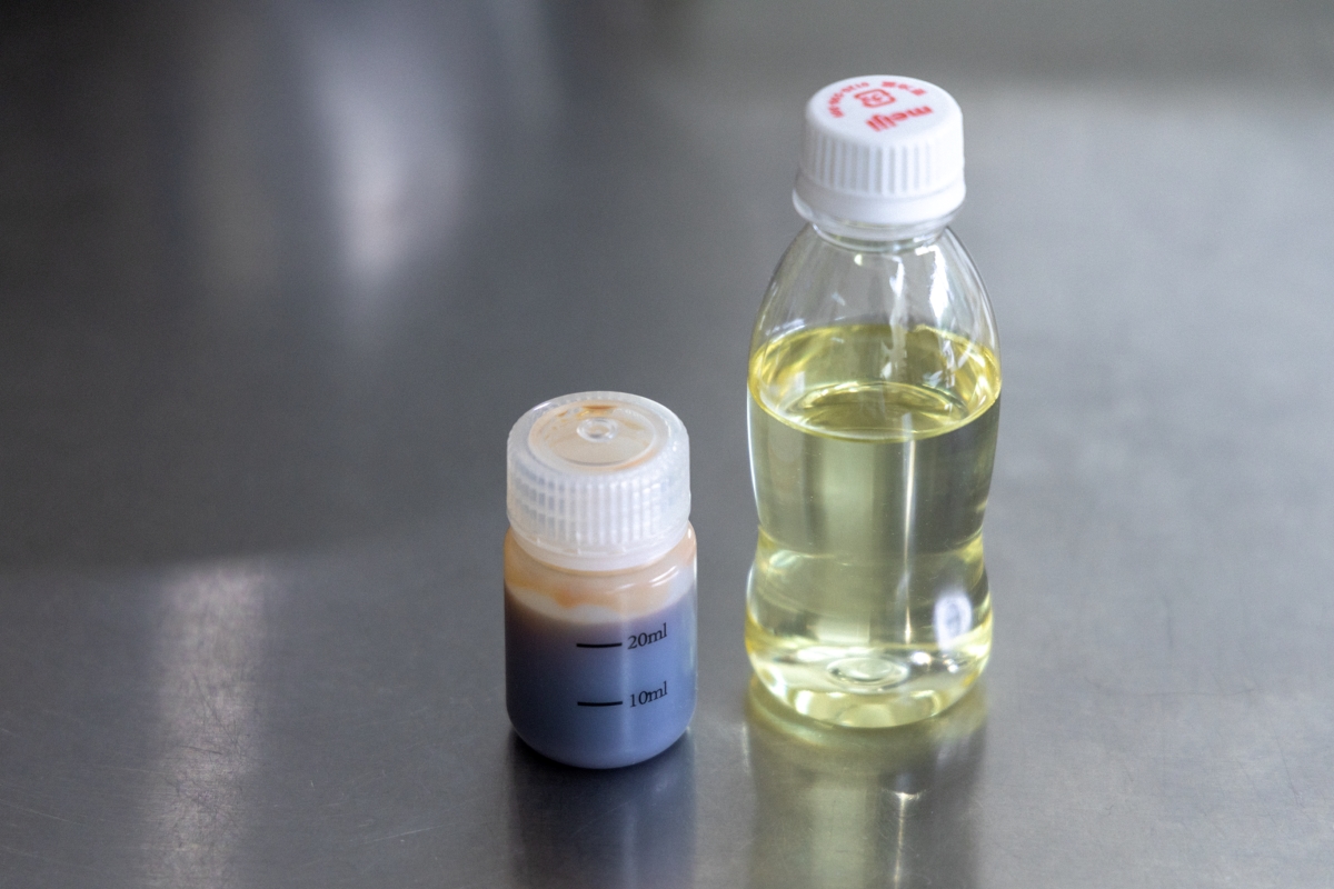 バックパック内での液漏れは悲惨のひとこと。「漏れないボトルはアウトドアショップで買うのが手堅いですが、明治のR-1のボトル(右)が手ごろサイズで使えます」。