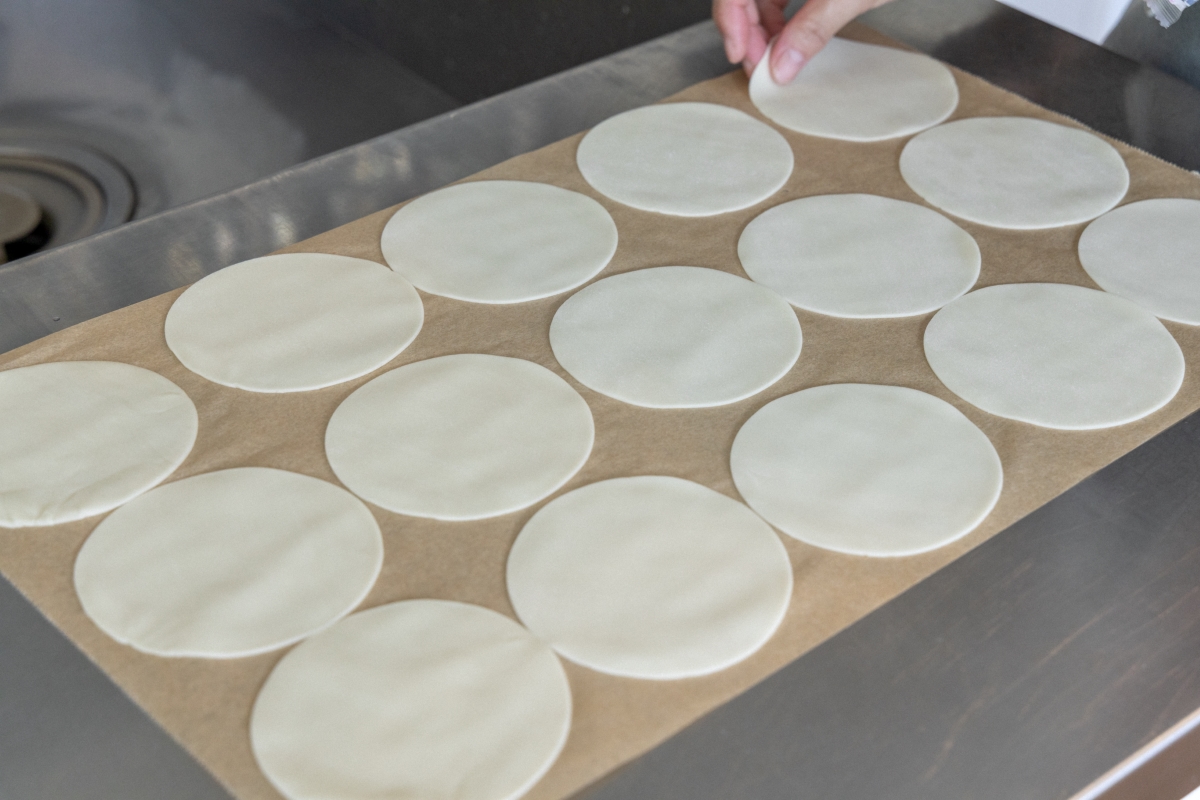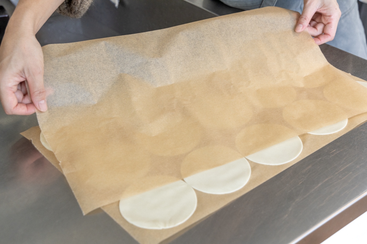 ①オーブン(クッキング)シートを手ごろな長さにカットし、皮を重ならないように敷き詰める。