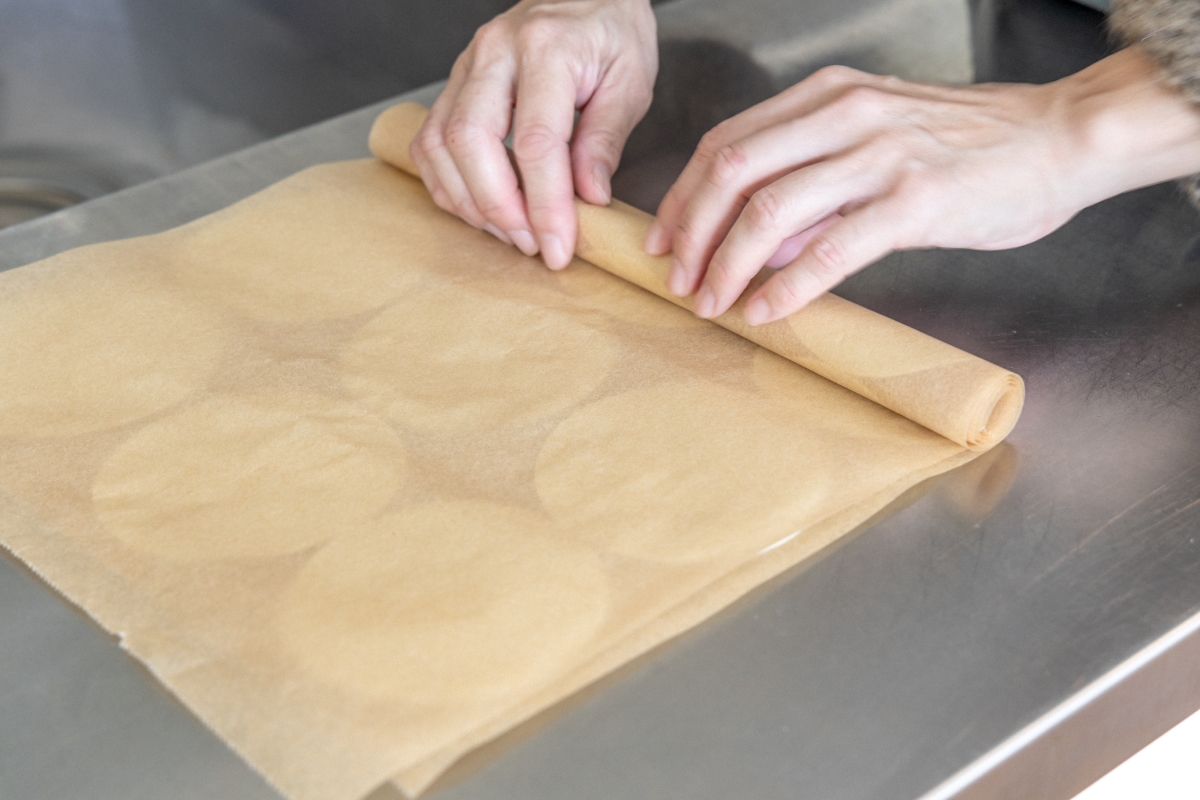 ③端からクルクルと巻いていく。シートは表面にシリコン加工がされ、液体を通さず食材がくっつきにくい。
