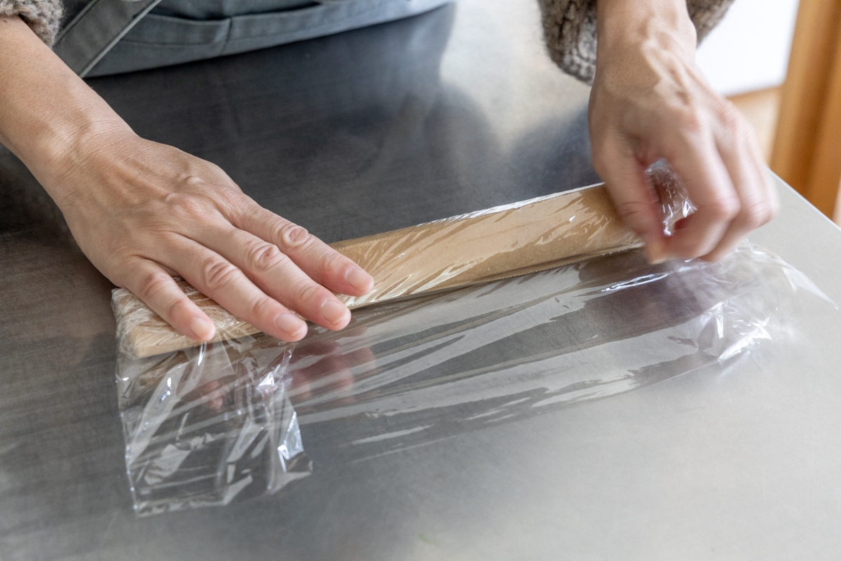 ④棒状になったシートをラップでくるむ。乾燥が心配な人はさらに密閉式ビニール袋などに入れておくとよい。