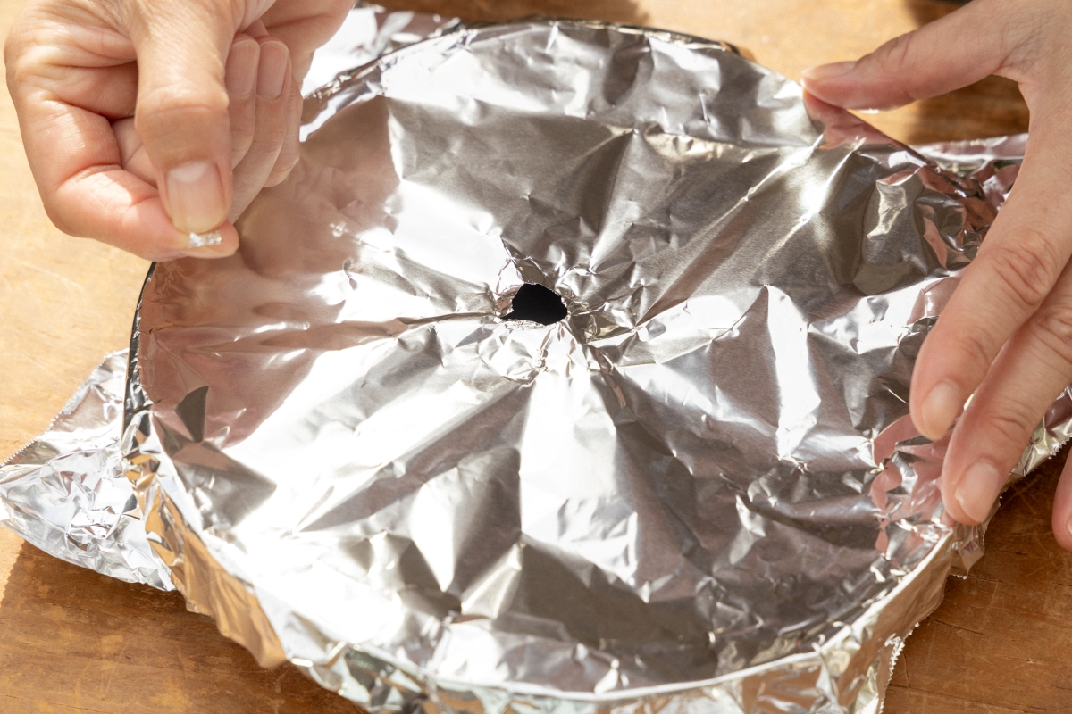 ①フライパンにフタがない場合はアルミホイルでフタを形作り、中央に穴を開ける。