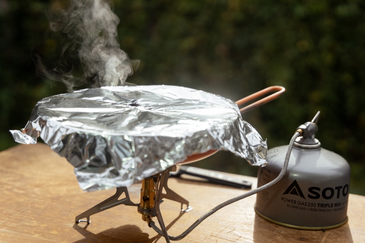 ④アルミホイルのフタをして中火(強風下では中強火)で5分蒸し焼きにする。