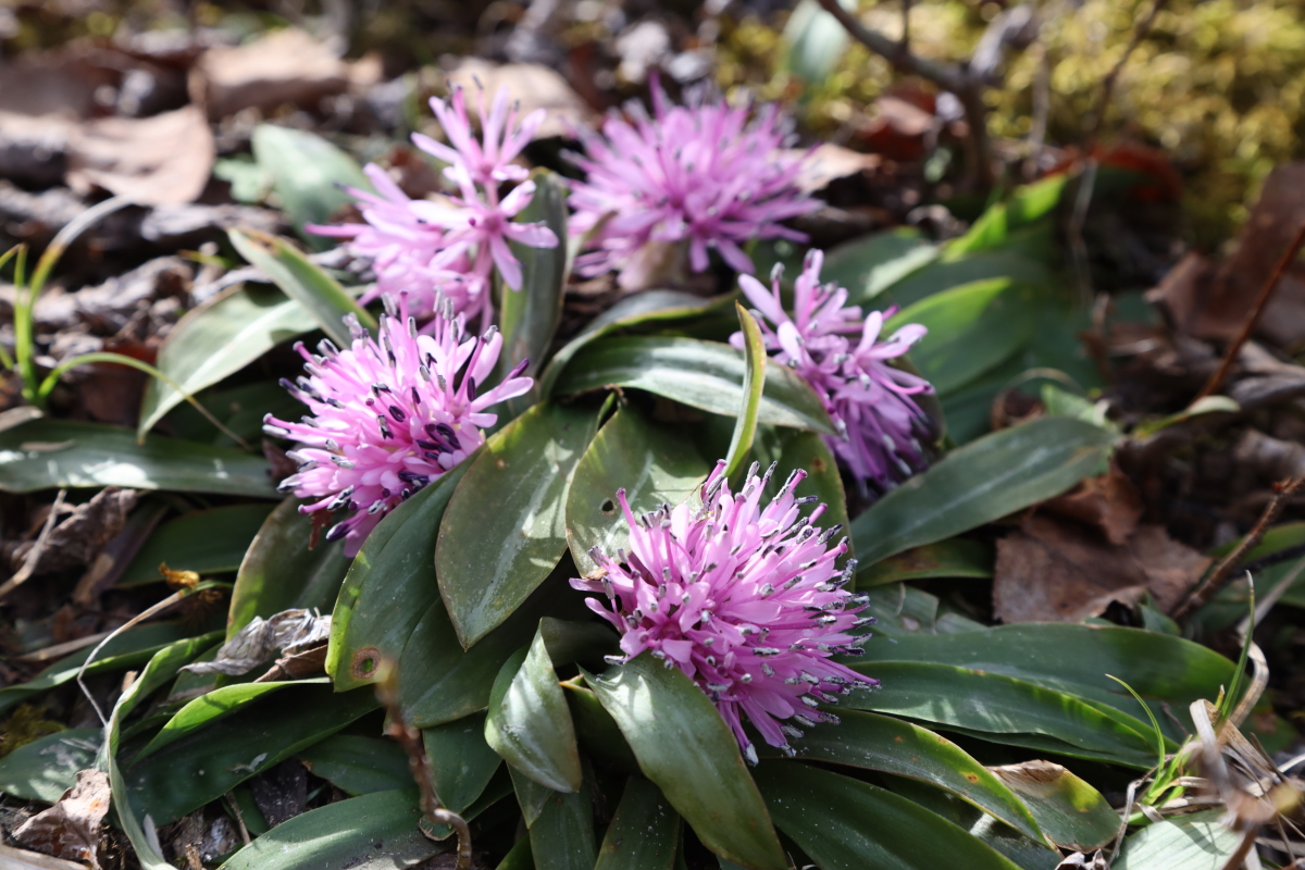 春が到来すると同時に、花火のカタマリのような赤紫の花がぶわーっと咲く。気分がアガっているハイカーが、ワーッとなる。これ、ショウジョウバカマのまわりで起こる、ひとつの現象です。ところで、ショウジョウバカマは茎が長い植物ですが、この写真では首をすぼめているみたい。下呂市の白草山、やや吹きっさらしのトレイル脇でのワンカットなんですが、標高が高いとやっぱり寒いんでしょうか?葉っぱのマフラーに埋もれているみたいで、カワイイ♥