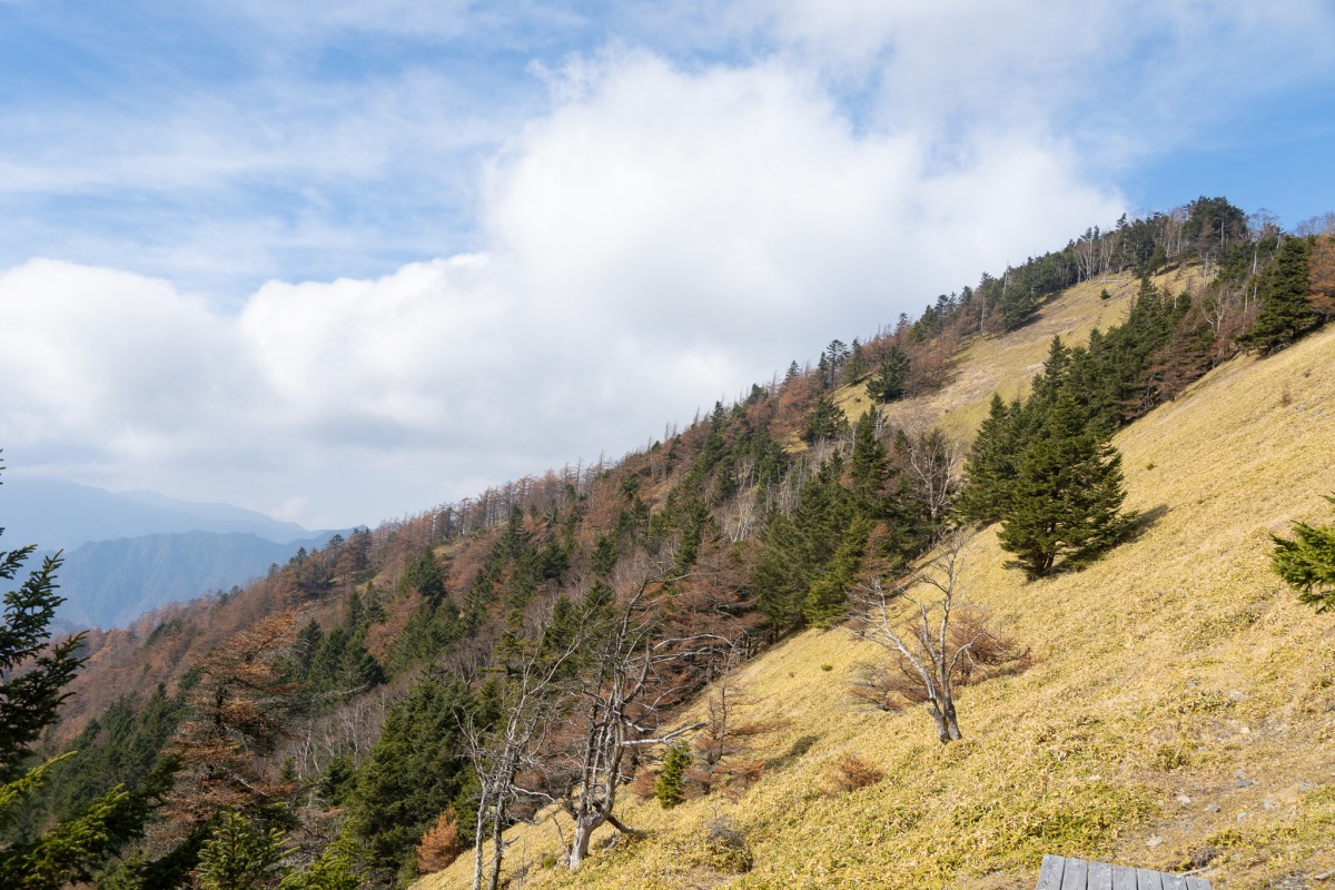 ギャップがあるといったように、ここから破風山避難小屋のある稜線の鞍部まで一気に下ります。稜線上にはところどころ立ち枯れの森が出てきて、独特な雰囲気のなか爽快な縦走を楽しめます。爽快なのは、下りだけかもしれません(笑)。下りたぶん、登るのは登山の鉄則。避難小屋からの登り返しはかなりタフな道でした。