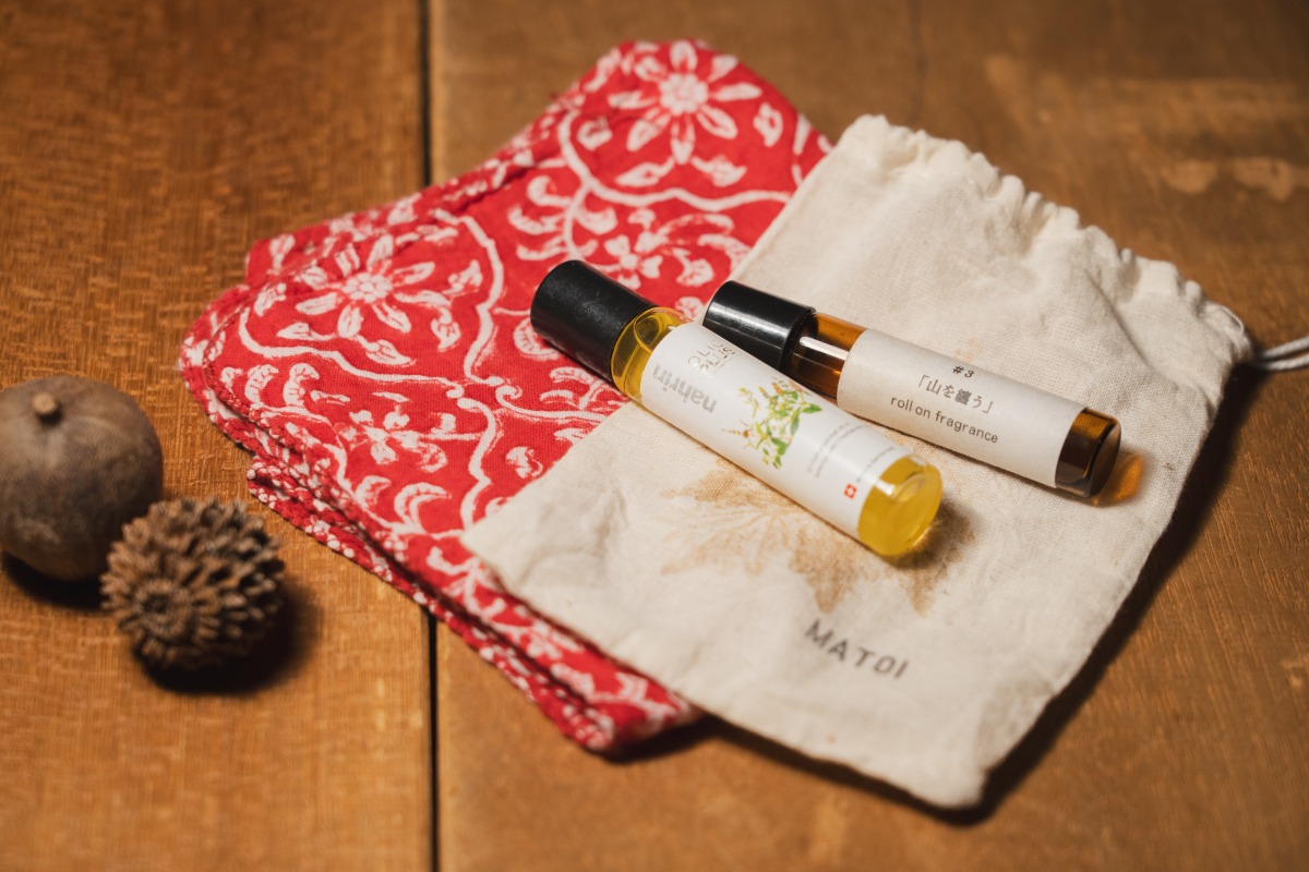 自身が手がけるブランド「纏」のオリジナル商品でもあるロールオン。8 種の精油をブレンドし、自然の色彩やにおい、風、音などを表現。「気分転換に手首やハンカチなどにちょんと塗って、リラックスできるお守りのような存在です」