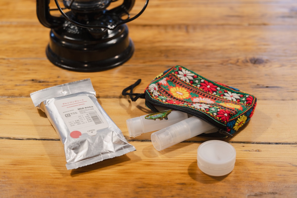 テント泊では、無印良品の小分け容器を重宝しているそう。「トラベルボトルに化粧水やクリームなどを入れ、ピルケースには、飲む日焼け止めを。メイク落としシートもコンパクトで、かさばらないので愛用しています」