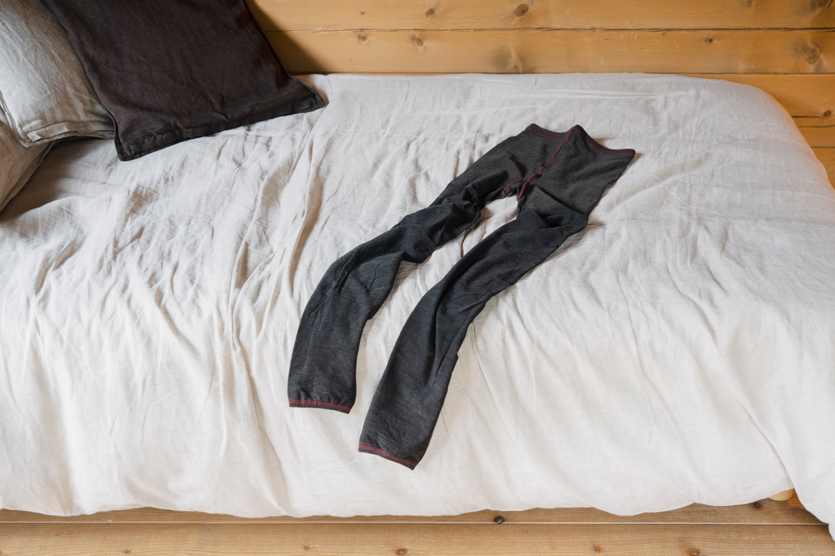 テント泊のときの防寒アイテムのひとつとして、高山植物図鑑のメリノウールレギンスを使用。「寝るときにダウンパンツの下に履いているだけで安心感のあるアイテム。わずか67g と、パッキングの負担にならないのもうれしい」