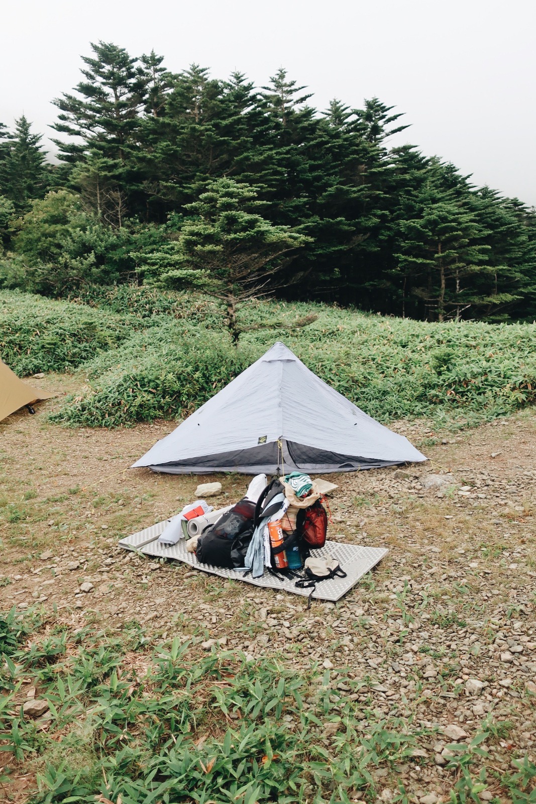 シックスムーンデザインズのルナーソロを使用。690gと軽量で、ふたりで寝られるサイズ感がちょうどいい。「色味と形がシンプルでかわいいところがお気に入り。シューズや調理道具などを置くスペースが充分に確保できる点もうれしいポイントです」