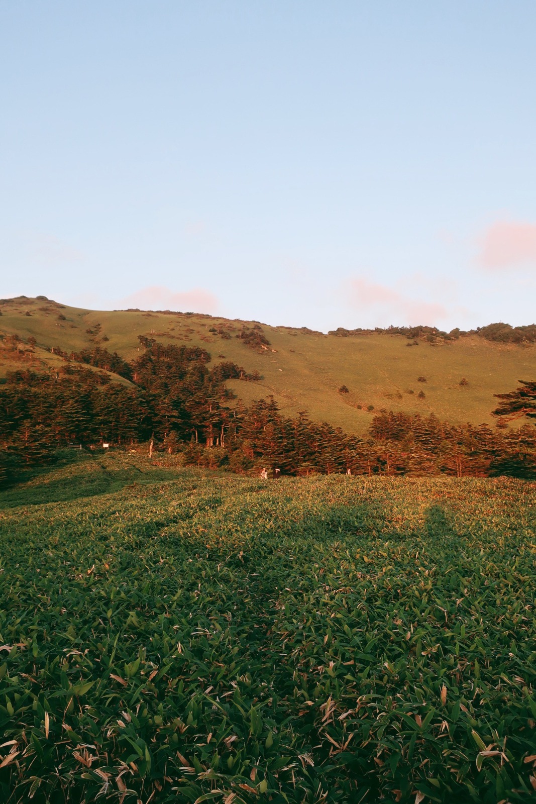 雄大な笹原のなかのテント場からの景色が抜群。夕陽に照らされ、赤く染まった瓶ヶ森を背に、少し散歩する時間がとびきりのぜいたく。このなかで食べるごはんも至福