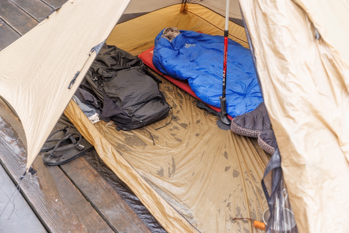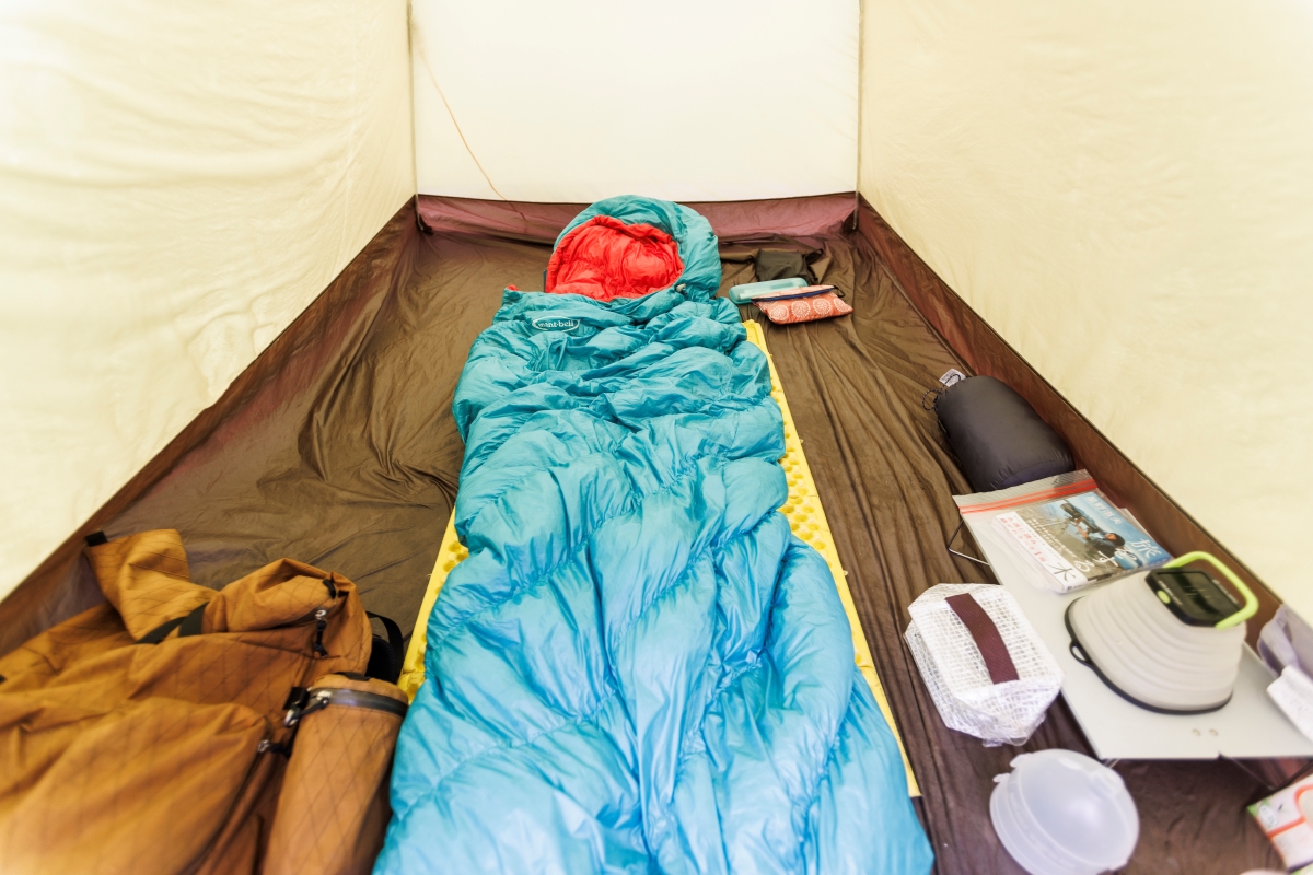 フロアの真ん中には、サーマレストのクローズドセルマットを置いている。「マットはバックパックに外付けなので、コンパクトにしたい。だから、思い切って半分に。足元の足りないぶんはバックパックでカバー。少し高くしてあげると、足のむくみ対策にもいいですよ」。