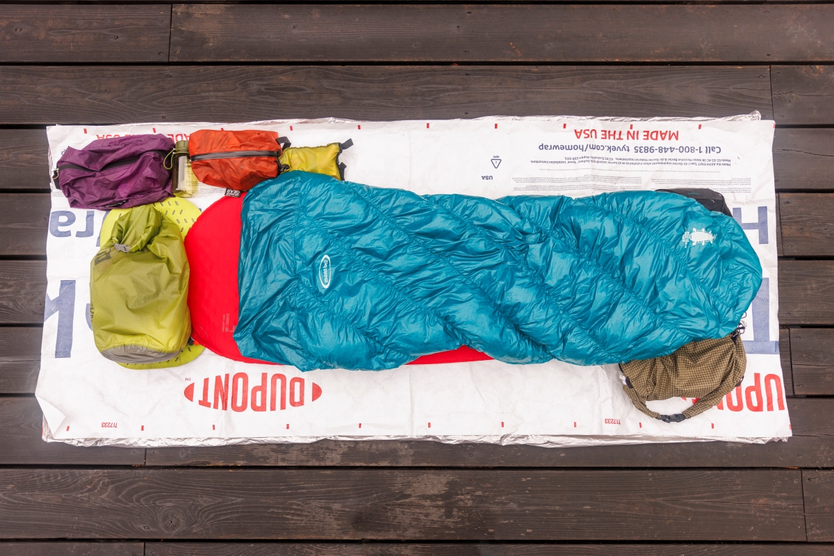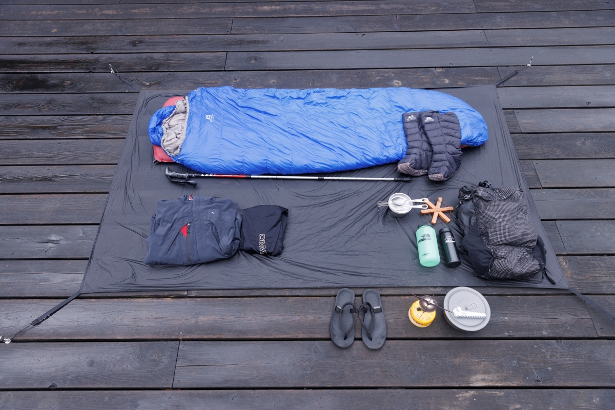 中央にサーマレストの自動膨張式マット(約120㎝)を置き、足元はバックパックでカバー。衣類を詰めたスタッフサックを枕にする。「ボトルやバーナー、洗面道具などの小物は『どこだっけ?』となりがちなので、枕の左側に。寝袋は、軽量化のために、フードのないタイプのモンベル3 番。体力に自信がないので、やっぱりなるべく軽くしたいんです」。