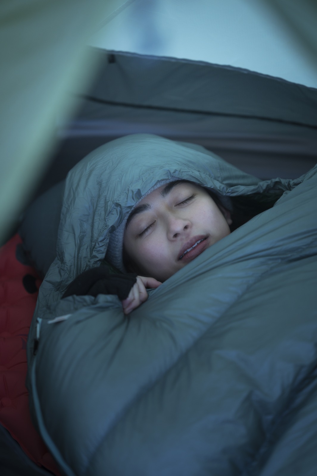 ▲テントの中で寝袋に入ると「秘密基地に隠れる子どもに戻ったようなスリリングな気分」と無邪気に笑うミノリさん。翌日は晴れ予報。願いが届きますように!