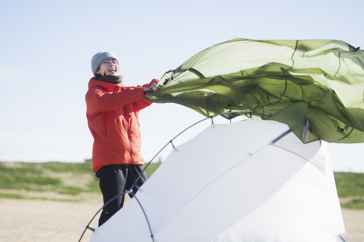 ▲願い叶って2日目は晴れ。しかし風が強く、暴れるフライシートと戦うミノリさん。畳んだテントを袋にうまく収納できなかったり、バックパックのパッキングがスムーズにいかなかったりと、設営よりも撤収のほうが苦戦。これもいい経験となりました。
