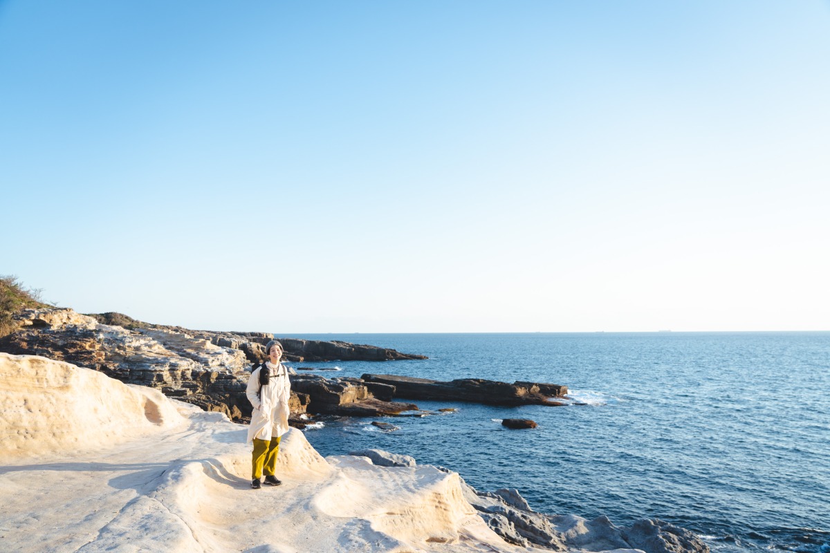 波の浸食によってできた平らな海底が、隆起した海岸段丘地形「千畳敷」。真っ白な砂浜が固まったような砂岩層には、浅海でできた地形特有の堆積構造のほか、生物の生活跡の証拠が残る生痕化石なども観察できる。