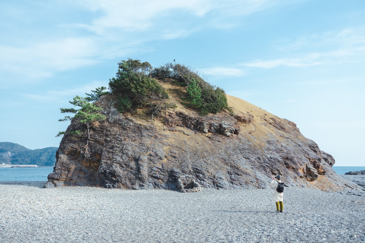 沖の黒島と、陸の黒島と岩礁から成る「黒島」。島があることで沖合からやってくる波は左右に回り込み、沿岸でぶつかる場所に砂礫の堆積するトンボロを形成。山のミネラルも豊富で魚が集まる場所でもある。