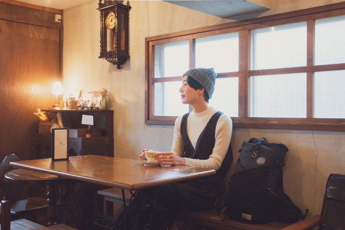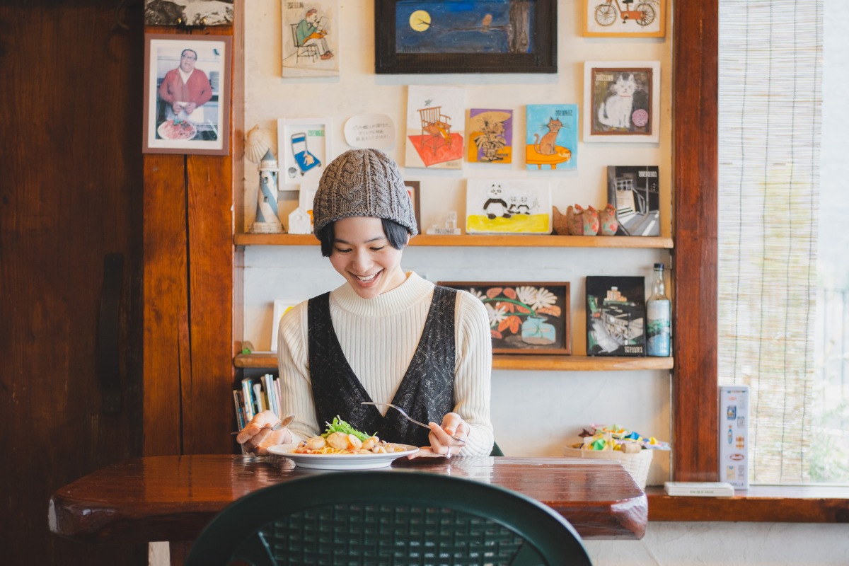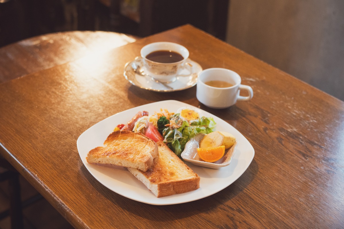 5年前に京都から移住したオーナー夫婦が営む、古民家を改装したカフェ。朝8時からオープンしていただけるモーニングメニュー(パンとサラダ、ドリンク付きで700円)は、地元の方のリクエストで始めたという。柔らかな照明が灯る店内にはこだわりの古道具が並び、つい長居をしたくなる居心地のよさだ。自家製コーヒーゼリー(500円)やプリン(限定6個、400円)もおすすめ。