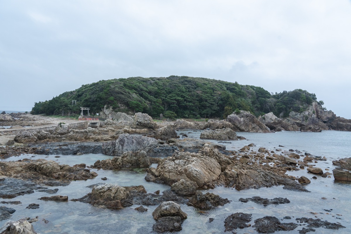 田辺市在住の南紀熊野ジオパークガイドの会・濱田千佐子さんが案内してくれた「江須崎」は、波食棚が隆起し海岸段丘になった地形が特徴であり、島全体が春日神社の社叢になっている神聖な場所。太い気根がほかの木に絡まるあこうの木や、暖地性植物のかずらの木など、この土地ならではの植生も見どころのひとつ。鳥居をくぐり、島をぐるりと一周しながら散策を楽しめる。
