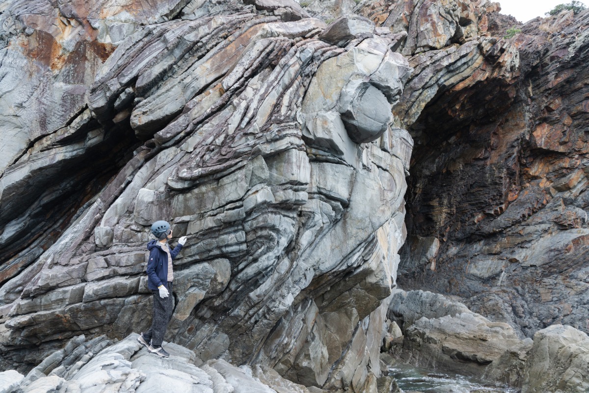 深い海の中で積もった砂岩泥岩互層がプレートの沈み込みにともない、岩としてカチカチに固まる前に大きく折りたたまれながら陸側に押し付けられ、くねくねと曲がる不思議な光景が広がる「フェニックス褶曲」。大地のパワーを目で見て感じられる場所。環境保全・保護・安全管理への配慮が必要なため、見学にはヘルメットの着用とガイドの同行が必須(要事前予約)。