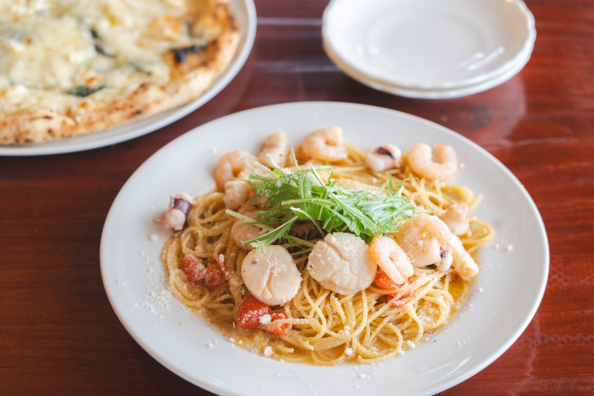 イタリアの雰囲気を感じさせる手作りの店内では、エビやホタテ、イカなどがたっぷりと入ったペスカトーレ(1,400円)をはじめとするパスタや、手作りの石窯で焼き上げるサイズ28cmのピッツァ(マルゲリータ/1890円)などをラインナップ。海を眺められるテラス席もあり、愛犬との利用もOK。人気店のため、平日、休日問わず事前予約がおすすめ。