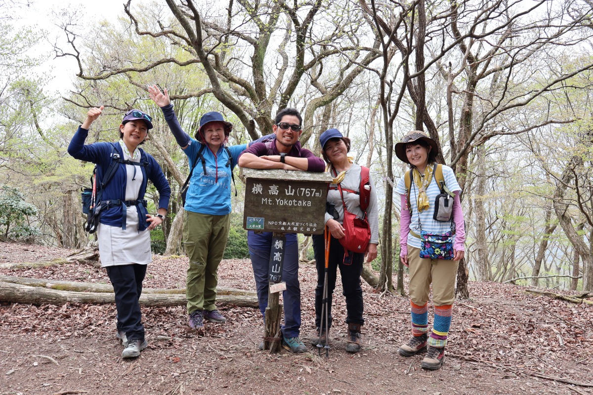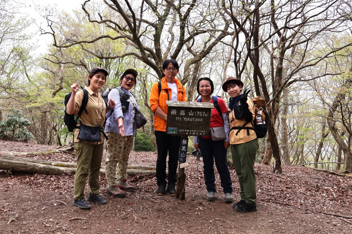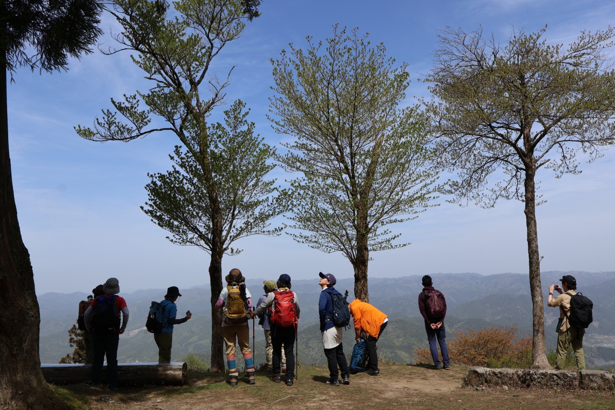 歴史の道をつなぎながら森林に囲まれたトレイルを進み、最後に急登を上がると横高山(757m)に到着!予定よりも早いコースタイムで山頂に着くことができ、ゆっくり休憩をとることに。上の写真は笹倉ガイド班、下は下田ガイド班。