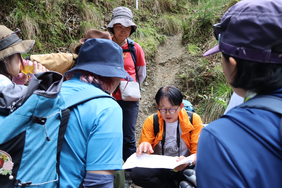 まずは叡電ケーブル・ロープウェイを乗り継いで比叡山頂駅へ。実際にトレイルを歩き始める前に今回歩くコースの概要や歩行距離、時間などの確認を行なう。笹倉ガイド班、下田ガイド班のふたつに分かれてハイキングスタート!