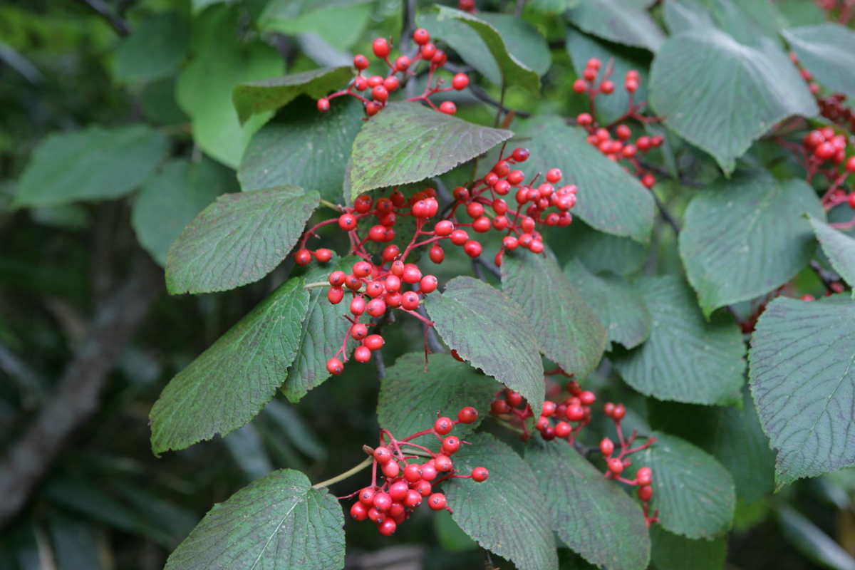 うむう。本当にグウの音も出ないくらいにスキがない……と諦めたくなりますが、そこはイジワル発揮。オオカメノキ、じつはヘンな別名があるんです(こっちが正式とも)。それが「ムシカリ」(虫狩り)。昆虫に葉っぱを食べられてしまうからという、ソレラシ~イ理由がついていますが、これは個人的に疑問符ですねぇ、うへへ。だって、秋になって赤い実をつけているオオカメノキを見ても、葉っぱが無傷。でも、ちゃちな疑いでは揺るがないのがこのお花の人気。どうしても清廉潔白に見えるのがクヤシイ~!!