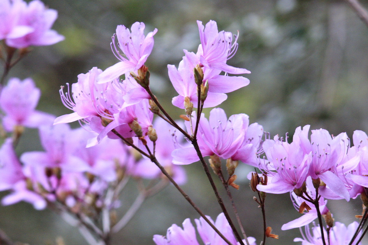 ムラサキさんはわりに日本海側に多い印象。で、われらが本拠地、東海地方に多いのが、アカヤシオでしょうね。なんといってもその特徴は、「優雅」。ふんわりとしていて、雄しべが短くて(これでも10本あるけど)、つましい印象。まあ、要はゆるふわオトメ系なんですな。で、ピンクなのに名前はアカヤシオ。ただ、もっと西に行くとそっくりピンクことアケボノツツジがいるとか。その見分けポイントとなるのが……。