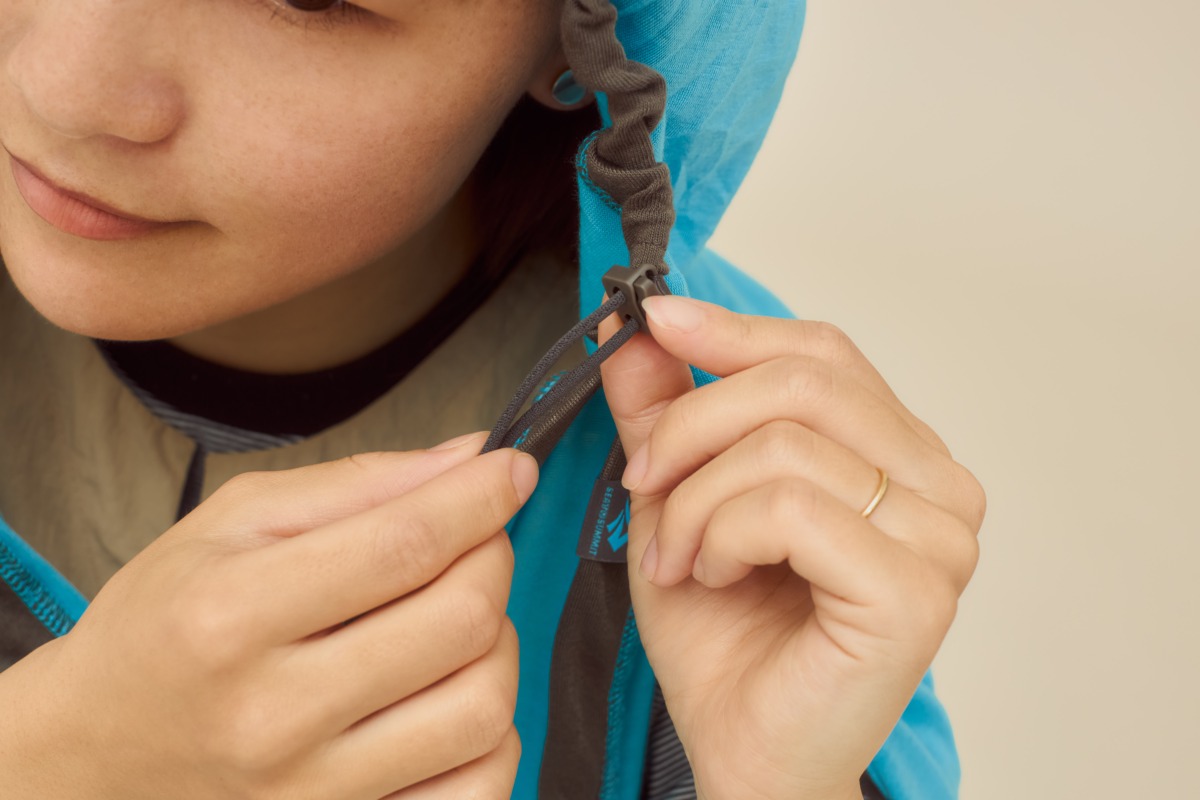▲フード部分にもドローコードが。顔まわりが寒いときなどにここをキュッと縮めることで保温性をキープし、睡眠中もずれにくい。