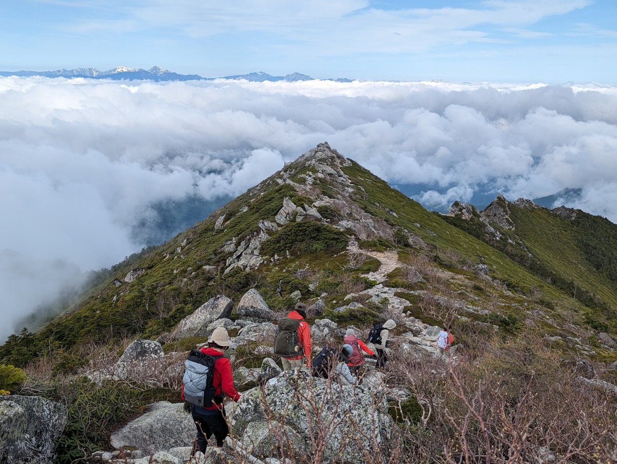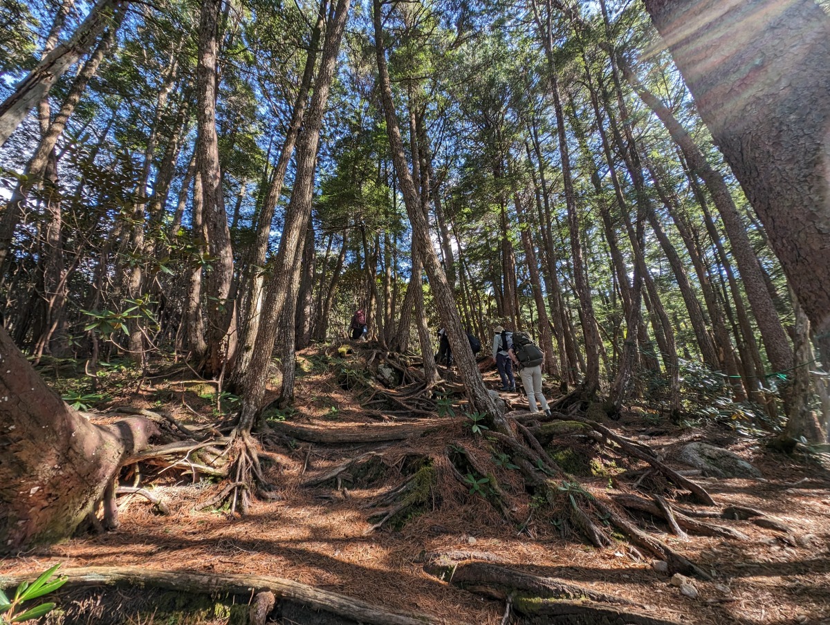 岩を抱えるようにして生えている木々、シャクナゲなど金峰山の植物の写真を撮りながら、参加者のみなさんとお話をしながら歩きました。