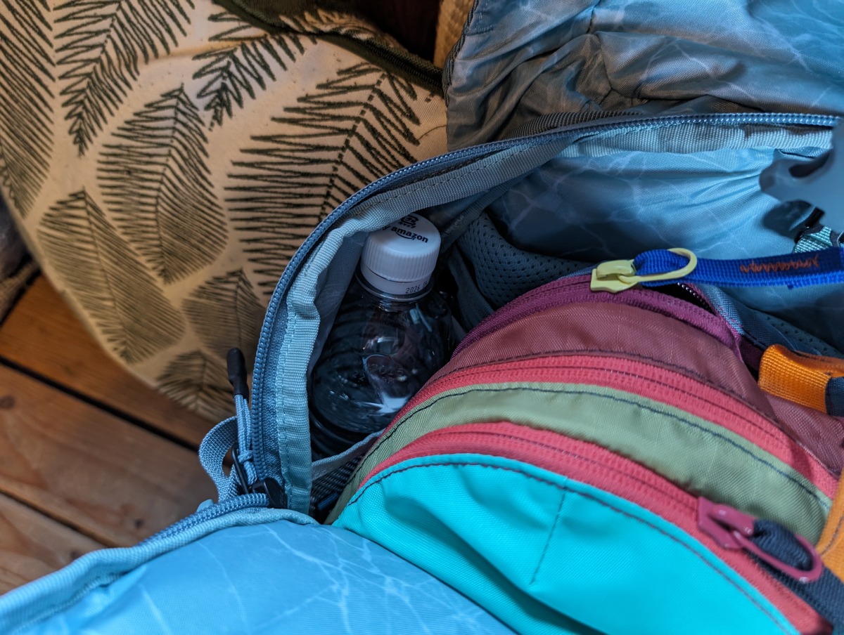 内側にレインカバーを入れるメッシュのポケットがあり、予備のボトルを入れておくと、ドリンクがバックパックの下に沈まず、必要なときにすぐに取り出せたのもよかったです。