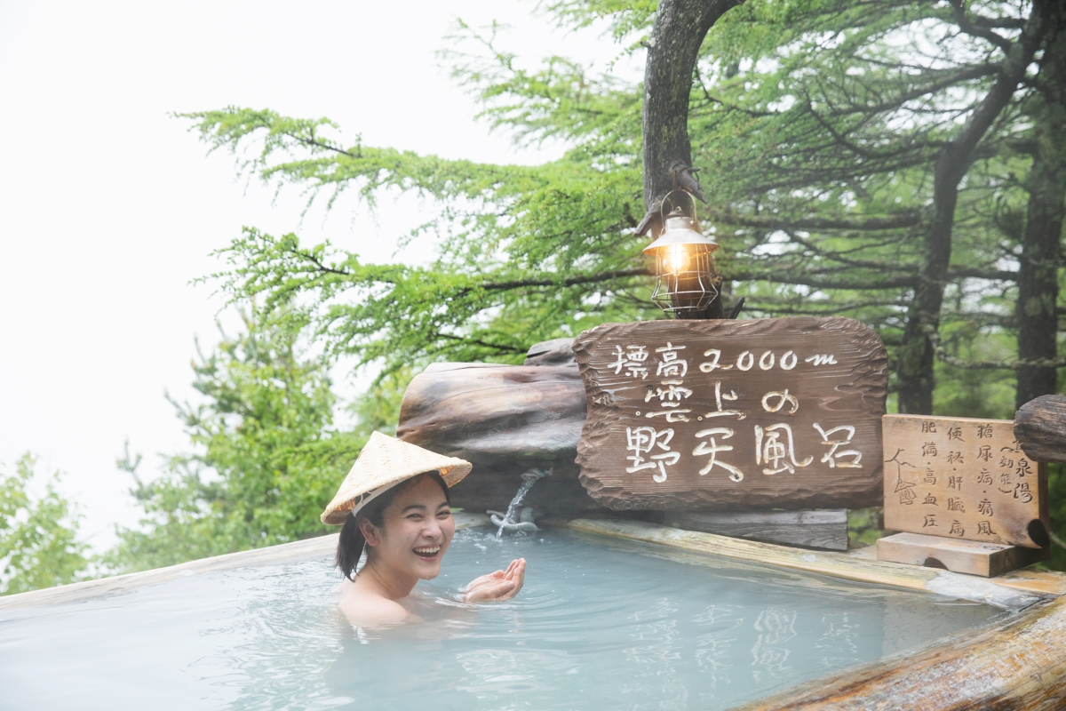 高峰温泉の始まりは昭和31 年。さまざまな苦難を乗り越え、1994年現在の山小屋風ランプの宿としてスタート。多くの登山客が訪れる館内には、山道具や植物の絵などが飾られ、居心地のよい空間に。硫黄の香りが立ち込める湯船には、36℃の乳白色の源泉と加熱泉が注がれ、交互に入浴するのがおすすめ。窓の外に広がる四季折々の自然を眺めながら、山歩きの疲れを癒す極上のひとときを。