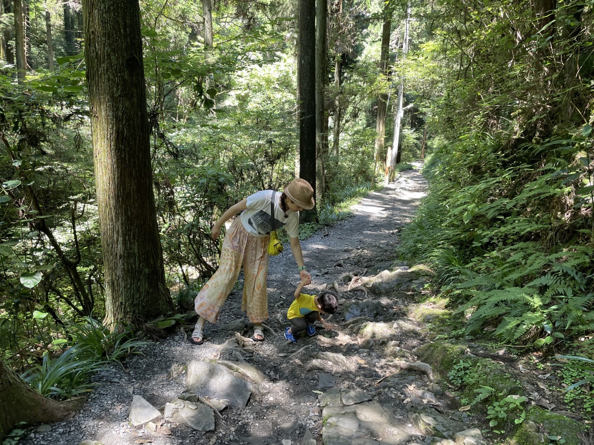 親子ともに水陸両用サンダル。息子は初めて自分で歩く登山道に「石が多くて進めないよ!」と、おっかなびっくり。ゆっくり15分ほどかけてたどり着いた、岩屋大師という洞穴の脇から沢に下りました。
