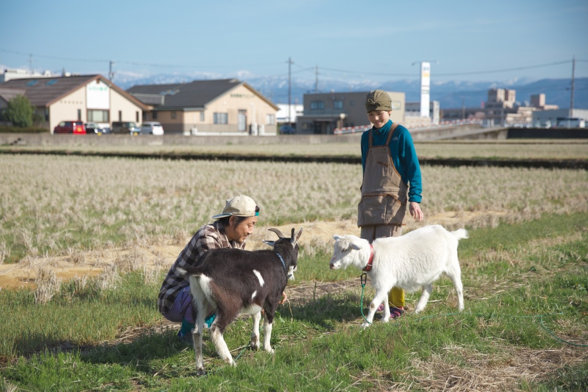 ▲工房に隣接する約 2.5ha の田んぼで、商品に使用している農薬化学肥料不使用の米を作っている。2 匹のヤギは家族でもあり、雑草を食べながら田んぼ周辺をきれいにしてくれる米作りの相棒でもあるそう