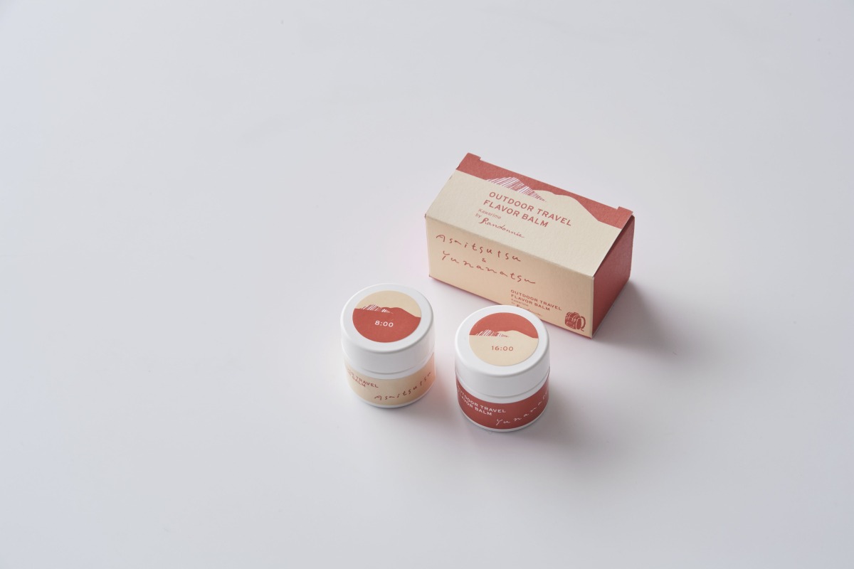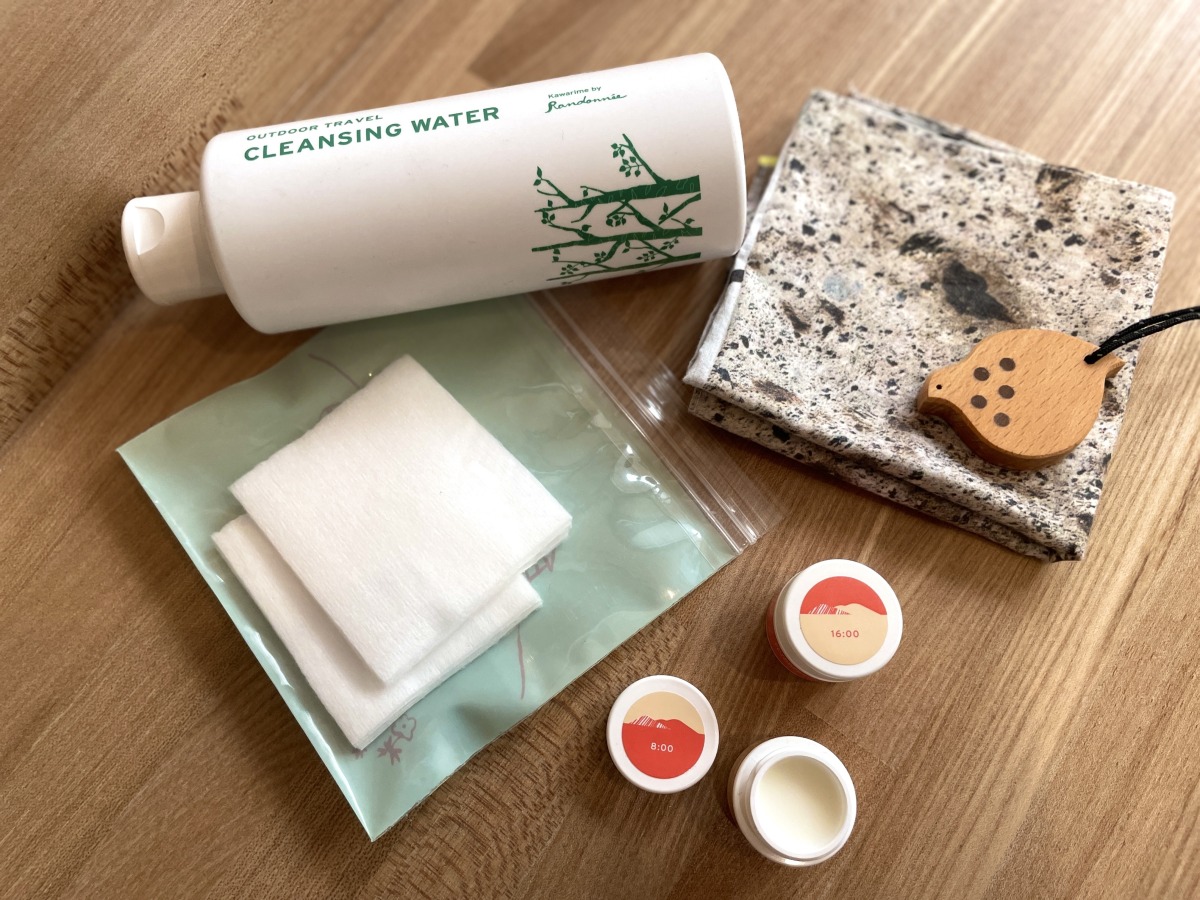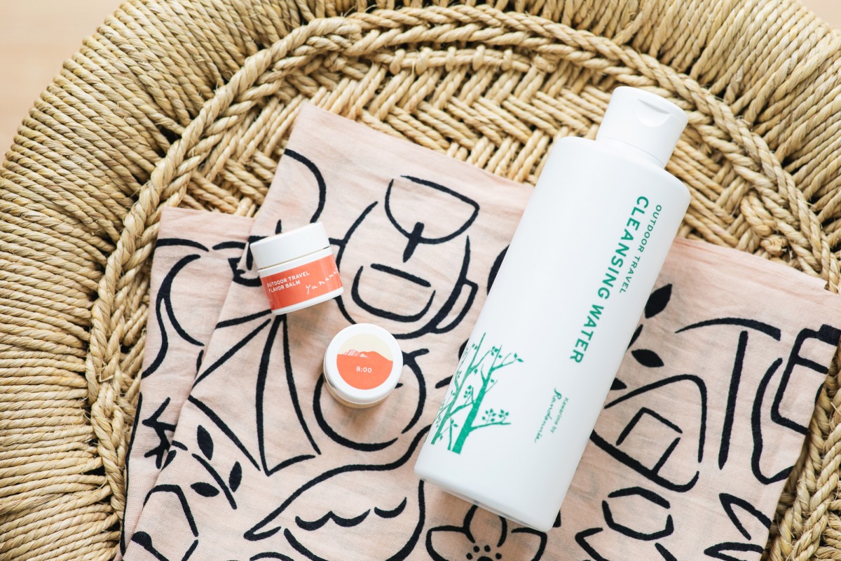 好評発売中の、かわり芽オリジナルコスメ。休憩中に肌をさっぱりとリセットして日焼け止めを塗り直したり、下山後にふもとでお風呂に入る前にメイクを落としたりするのにおすすめの「アウトドア旅のクレンジングウォーター」。そして、「8:00 Asaitsutsu」と「16:00 Yunanatsu」のふたつの香りを楽しみながら、肌や髪、リップなどにつけることができる「アウトドア旅のフレーバーバーム(2個セット)」。