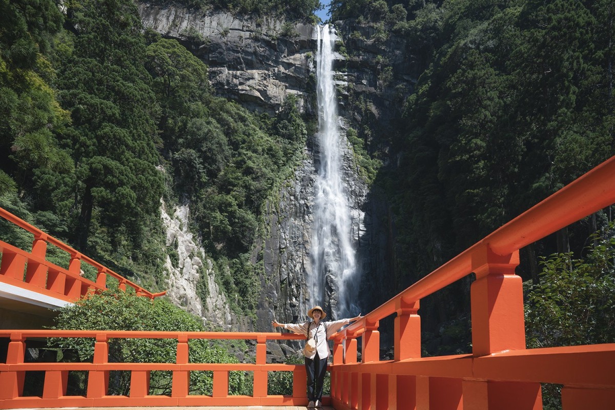 大門坂をすぎ、階段を上っていくと熊野那智大社が目の前に。はやる気持ちを抑えながら境内に入り、社殿の前に立つ。どっしりと構えるその姿は荘厳で美しい。お詣りをしたら、熊野那智大社の別宮・飛瀧神社の御神体である那智の滝へ。