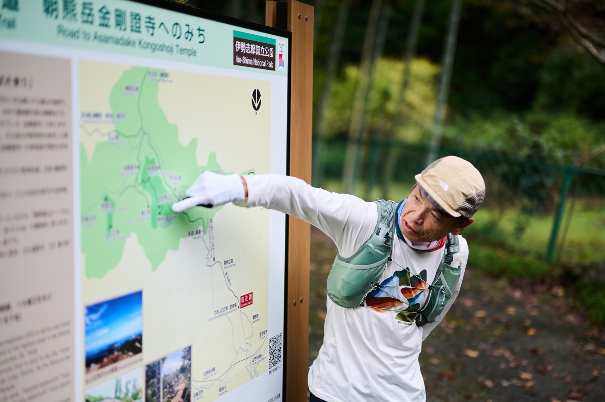 昼食後は、伊勢志摩国立公園最高峰の朝熊ヶ岳へ。「お伊勢参らば、朝熊かけねば片参り」と伊勢音頭の一節でも唄われているように、伊勢神宮へお参りする人は、朝熊ヶ岳へ登り、金剛證寺にも参詣するのが習わしだったのだとか。ここからの道を案内してくれるのは、「BUD PALMS」店長の山本学さん。