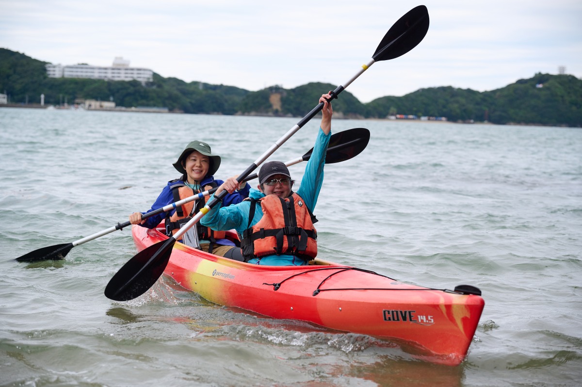 鳥羽に戻ったら、待ちに待ったシーカヤックに挑戦!きくさんときえさんに陸上で漕ぎ方を教えてもらい、ライフジャケットを装着し、浅瀬で軽く練習してから沖へ。