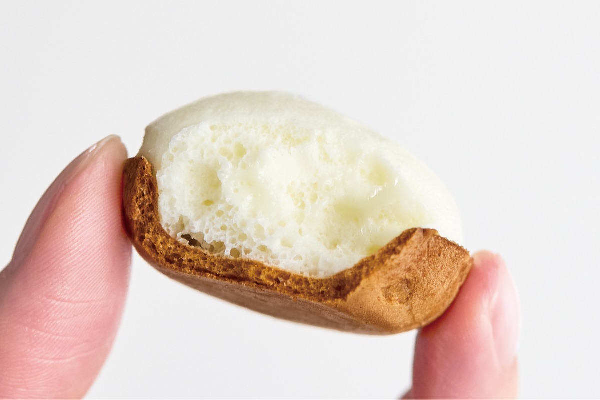 最大の特徴は、ふわふわとした食感。チョコレートとの相性を考えた薄さや焼き加減を追求し、北海道産の牛乳をたっぷり使用したクッキー生地を開発。この生地を直火でていねいにはさみ焼きすることで、サクサクとした食感が生まれました。クッキーの上にのったホワイトチョコレートは、たっぷり空気を含ませて軽やかなくちどけに。口に入れた瞬間、まるでパウダースノーが舌の上で溶けていくような、これまでにない食感を楽しむことができます。
