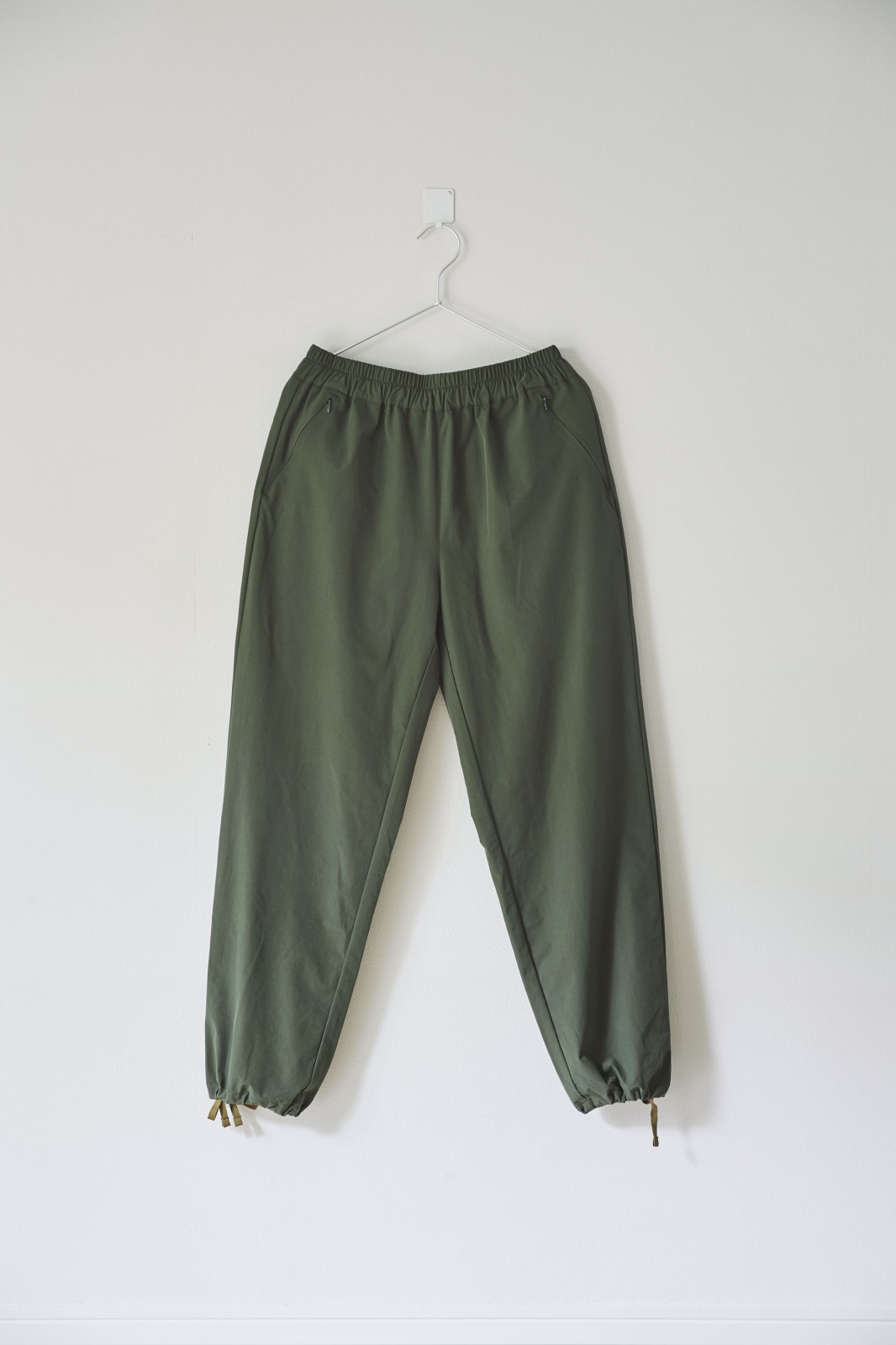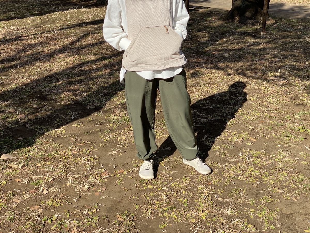 裾にはドローコードではなく、あえて紐を施したところも、このパンツの特徴。自分好みに裾を絞って、パンツのシルエットを調整。私は、ぎゅっと絞って履くのがお気に入り。合わせる靴もローカットにすれば、リボン結びした紐を見せられてポイントになる。