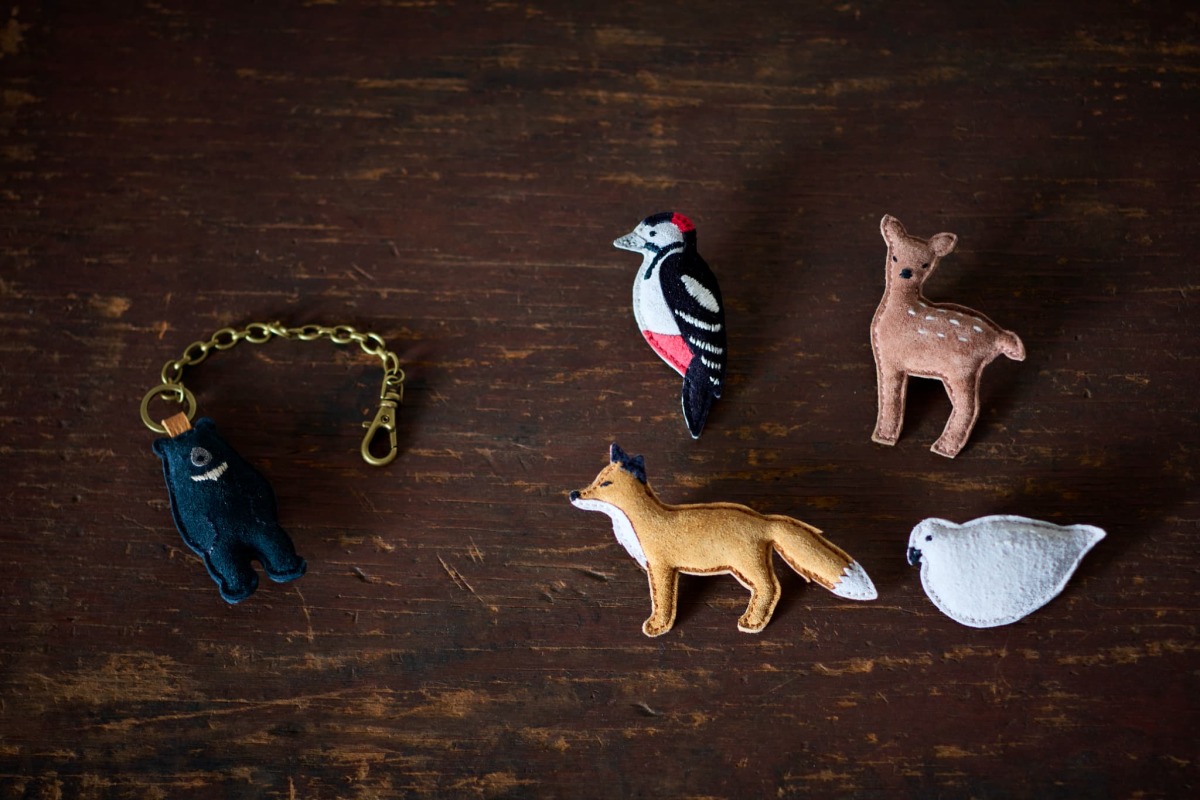 山の動物のブローチ。セーターなど冬の装いのワンポイントに。(右上から時計周りに)シカ2,750円、ライチョウ(冬・メス)2,530円、キツネ3,300円、アカゲラ3,520円