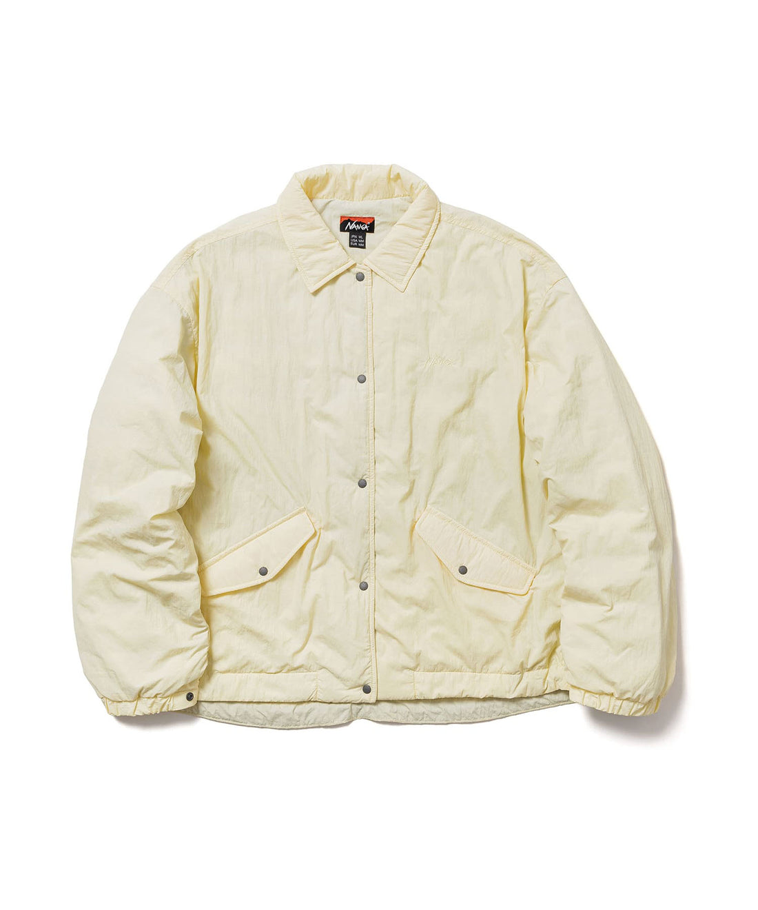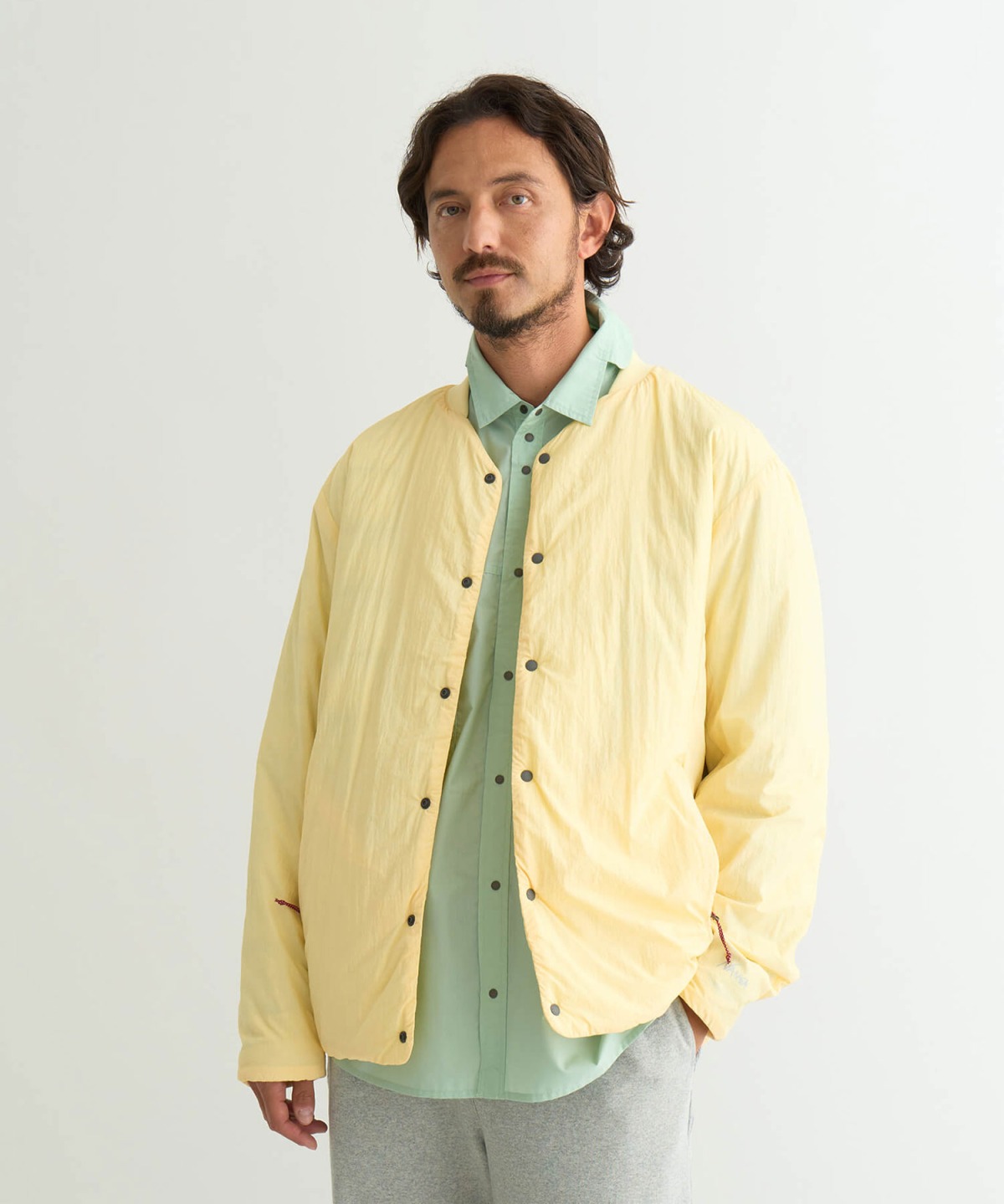 ふんわりソフトな着心地と軽やかな着用感が魅力の一枚で、春や秋のアウターとしてはもちろん、すっきりとしたノーカラーデザインなので、いまの時期はインナーダウンとしても活躍しそう。襟部分と袖口にはスムースジャージを採用したことで、フィット感が高まり、心地よい肌ざわりです。