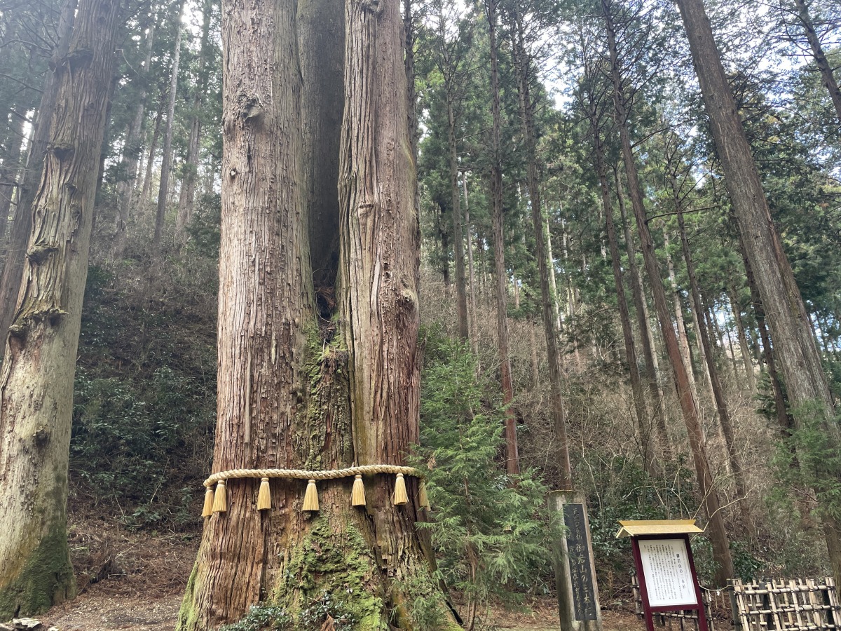 樹齢500年以上と推定される樹高50m、幹囲8.4mの「御岩山の三本杉」を見上げ、真っ赤な大仁王門をくぐり、まずは御岩神社で手を合わせます。そこから先は、左手に進んで表参道へ。一歩ずつ参道を進むと、あっというまにご祈祷の太鼓の音は届かなくなり、まっすぐ伸びるスギの木が風に揺れる音だけが聞こえてきます。背筋が伸びるような静けさ。小さな川沿いに延びる道は、次第に傾斜を増し、木の根が張り巡らされた本格的な山道に。