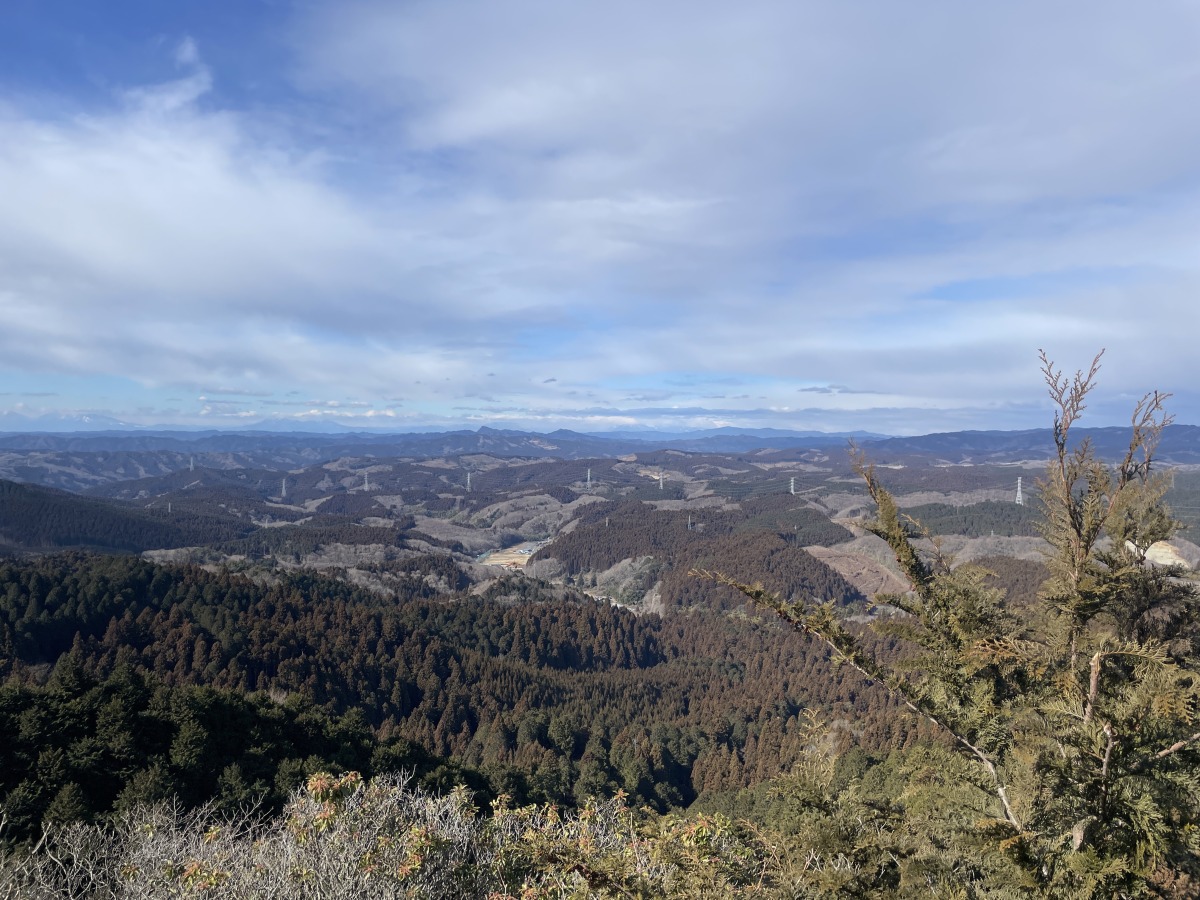 賀毗禮(かびれ)神宮に立ち寄り、その先、裏参道と山頂の分岐を過ぎると、葉を落とした広葉樹の木々に囲まれた道に。そのあいだからは、澄んだ空の青が見え「これは冬の山ならではなんだよな」とつぶやいたりする。御岩山山頂を示す矢印に導かれて、たどり着いたその場所からは、広い空と、小さな山が敷き詰められたような絶景、遠くに雪をかぶった男体山や高原山などを眺めることができました。