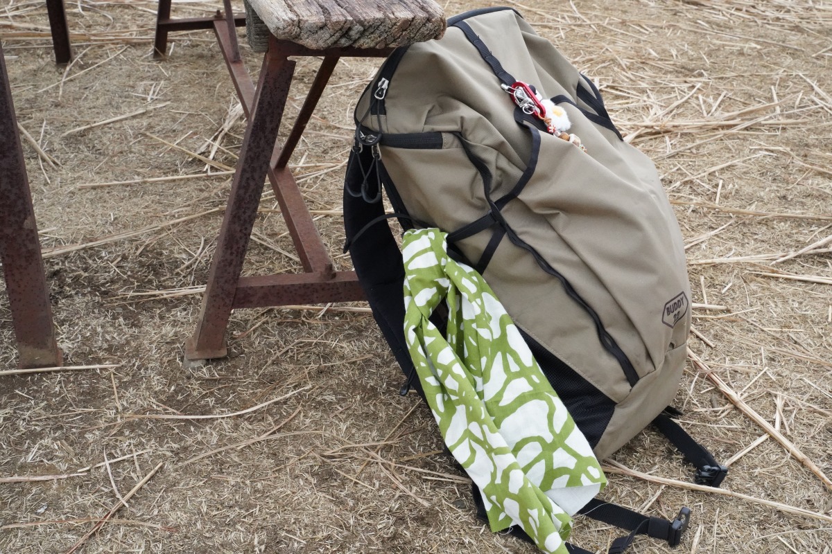 バックパックにつけてみるとこんな感じ。私の圧倒的一軍のバックパック、パーゴワークスの「BUDDY 22」にぴったりすぎる色合い。コーディネートのアクセントとしてつけるだけでも、気分があがりそうです。