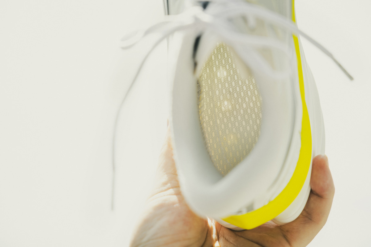 こうした印象はミッドソールの素材からくるような気がする。適度な硬さと軽さが、日にかざすと透けて見える(写真)、独特の素材使いが、そんな印象を生み出すのか。