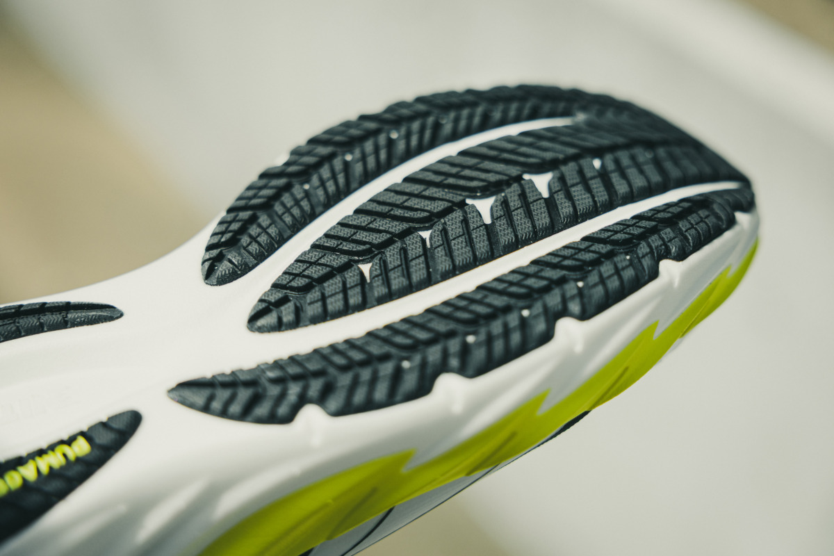 このシュータン領域のしっかりとしたホールド感と、つま先まわりの開放感。この「メリハリ」の効いたフィット感が、じつに心地いい。足首をしっかりと固定しつつも、蹴り出しの際にはつま先がストレスなく広がる。まさに「アメとムチ」のような、明確で計算されたストラクチャーが、走る楽しさを引き出してくれると感じる。