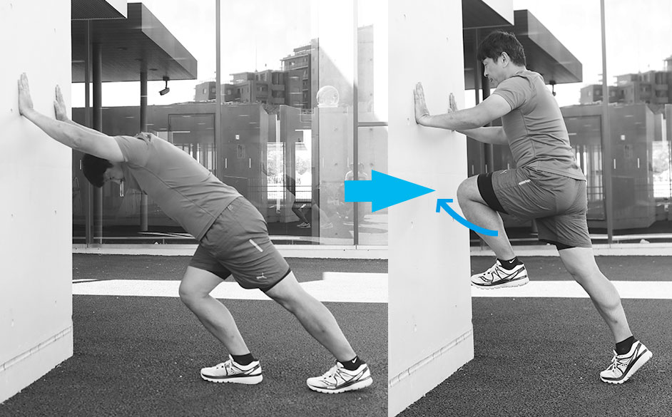 両手を壁に着き、頭からつま先が斜め一直線になるように前傾姿勢になる。そこから片脚を股関節から大きく引きつけ、うしろへ伸ばす。一連の動作をラン前に左右10回。
