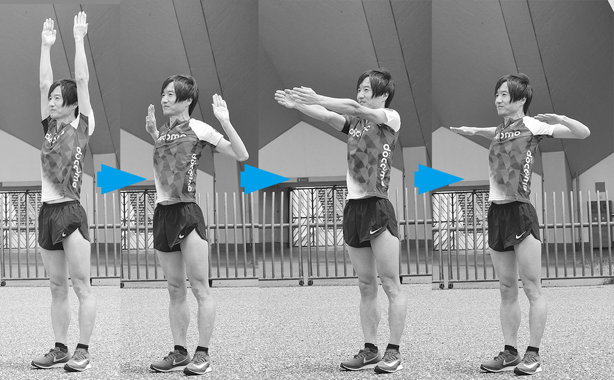 足を肩幅に開き、姿勢を正した状態からスタート。まずは腕をまっすぐ上げてから、手の平が外側を向くようにヒジを曲げ肩甲骨を引き寄せる。今度は前方に腕を伸ばしてから、手の平が下を向くように肩甲骨を引き寄せる。この4つの動作を繰り返し行うことで、肩まわりに柔軟性が生まれる。